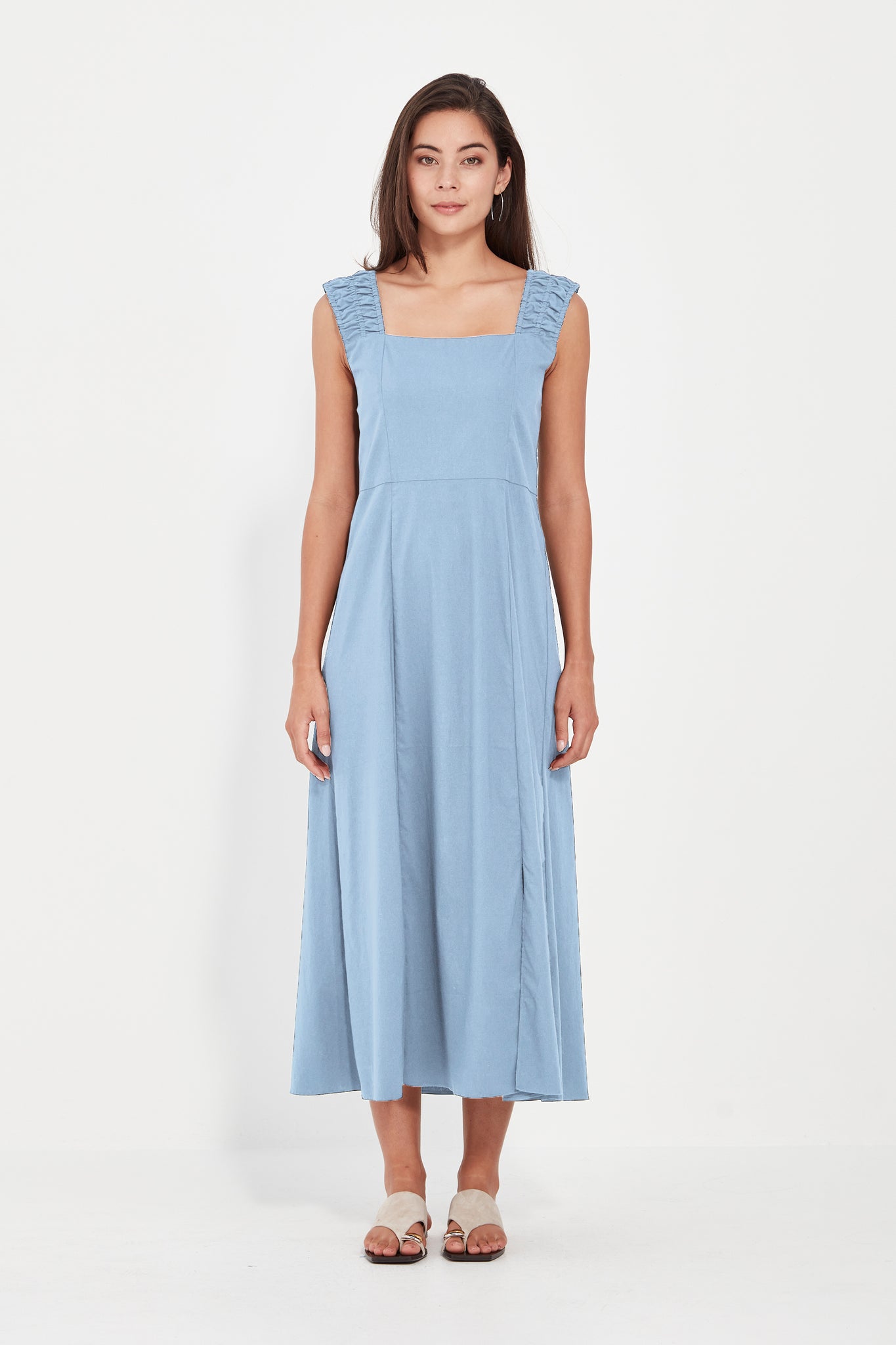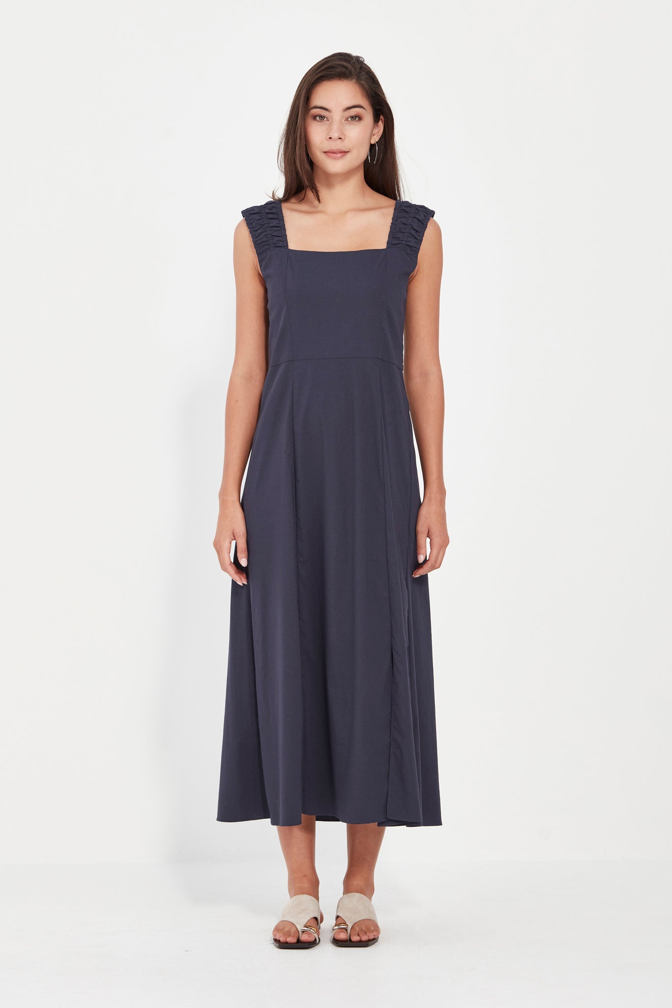 The Acrobat Mambo dress is crafted in our exclusive European lightweight, stretch cotton Acrobat fabric for comfort, breathability, and easy care. The Mambo dress features a wide shoulder strap with ruched detail. The Mambo dress is waisted with panels through the skirt for movement. Side split on the side of the front panel. The Mambo dress falls to mid calf.
